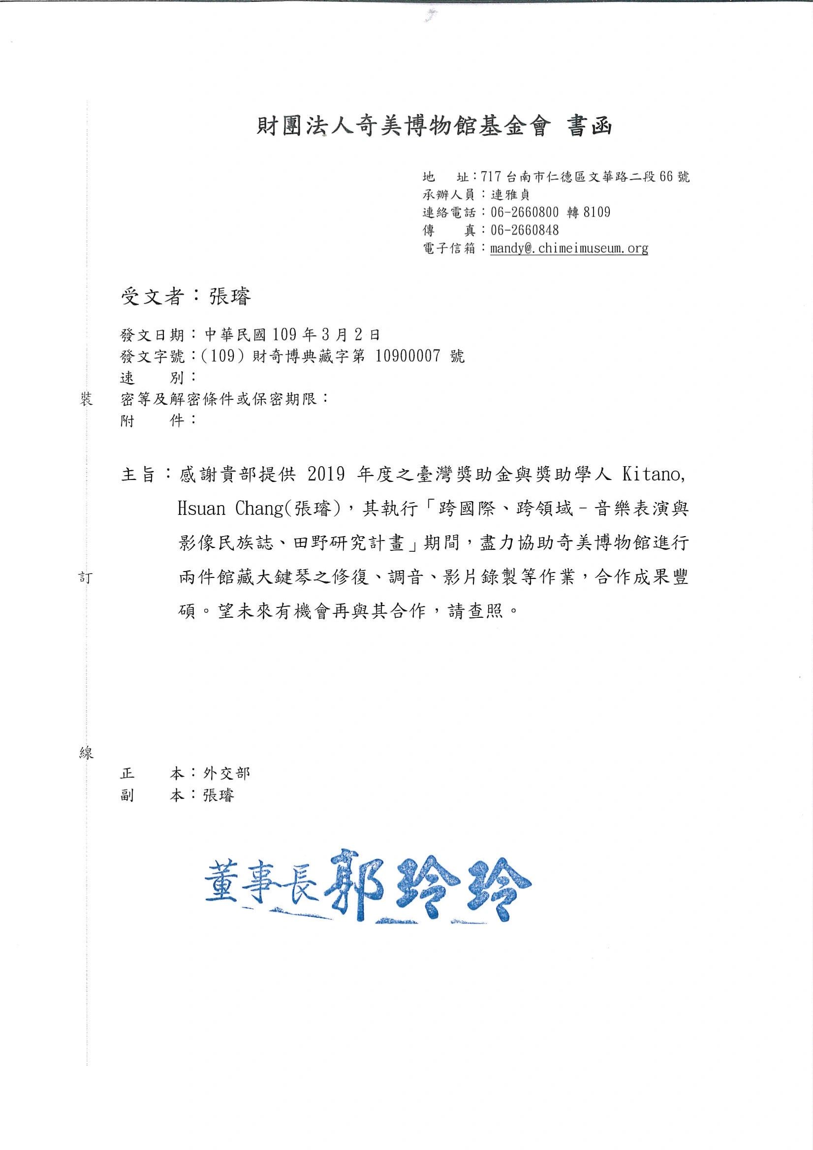 MOFA for awarding Dr. Kitano. Throughout her "Cross-cultural and Interdisciplinary Project"in ethnography and field research, Kitano exhibited unwavering dedication. Under his guidance, projects were successfully and productive executed, including the public exhibition of the museum's instrumeent collection. We eagerly